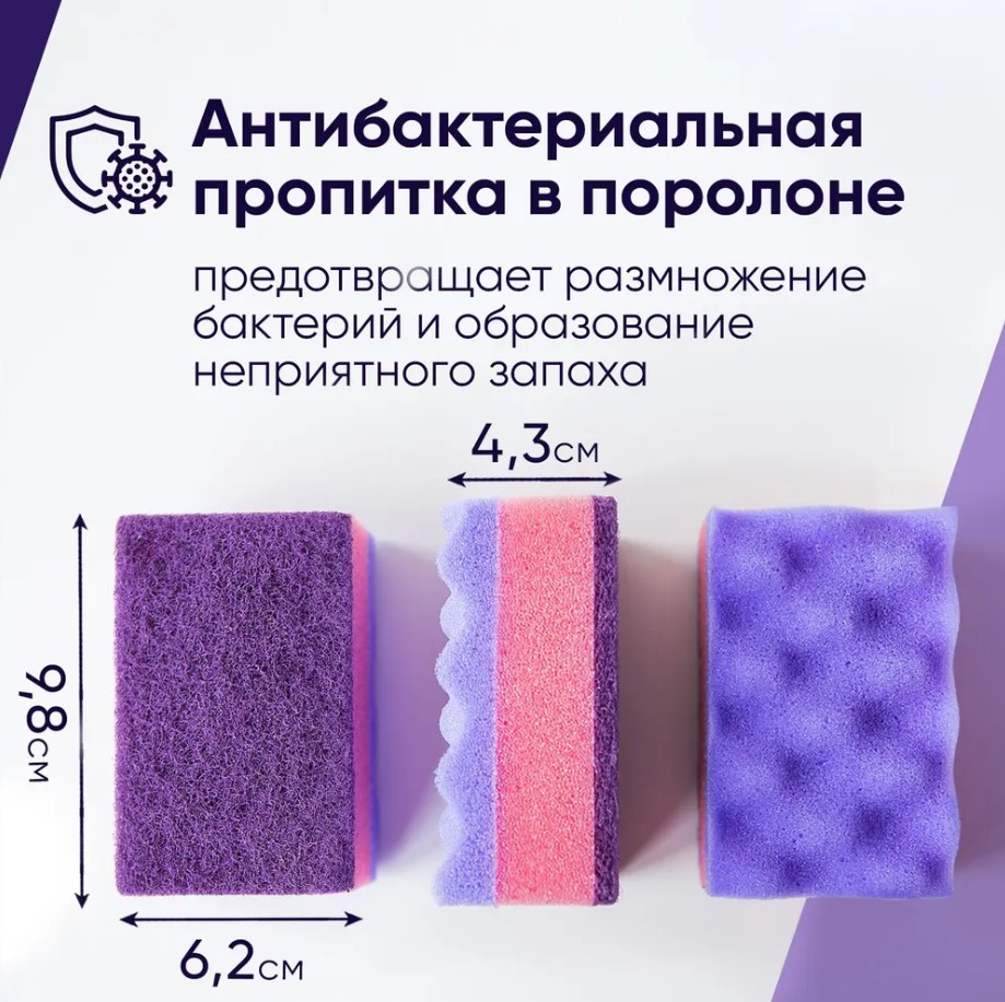 Губки имеют плотный поролон, который остается износостойким даже после длительного использования. Они также способствуют активному образованию пены и обладают хорошей впитывающей способностью, что позволяет снижать расход моющей жидкости и чистящих средств до 18%. Губки быстро высыхают, что помогает предотвратить накопление влаги и препятствовать росту грибков и плесени.