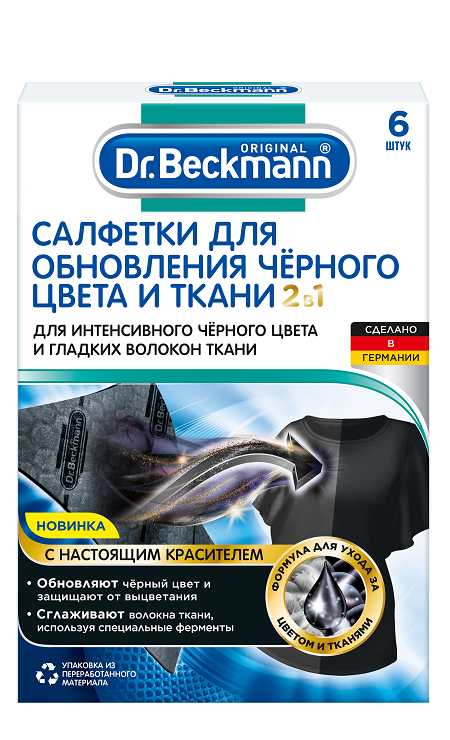 Новый продукт Салфеткам для обновления чёрного цвета и ткани с инновационной формулой по уходу за цветом и волокнами восстанавливает и защищает черные ткани при стирке, вы получите вещь с интенсивным чёрным цветом и красивым видом с минимальными усилиями.
