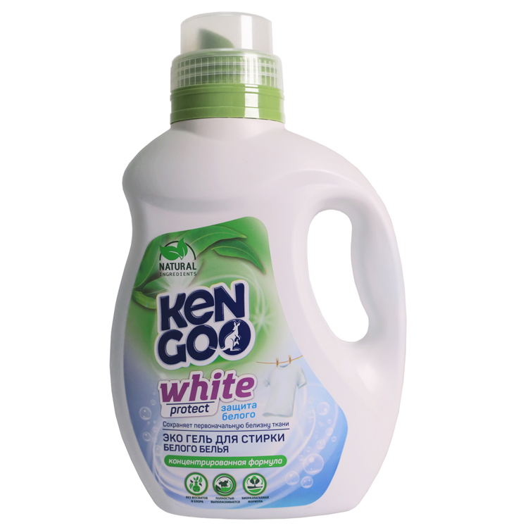 ЭКО Гель концентрат для стирки белого белья KENGOO White protect 1л на основе растительных ПАВ деликатно удаляет самые застарелые загрязнения и полностью разлагается, не нанося вреда природе. Гель специально разработан для изделий белых и светлых тонов. Формула средства поддерживает сияние белизны, препятствуя появлению серого оттенка и повторного оседания загрязнений. Благодаря отсутствию в составе такого агрессивного компонента как хлор, ткань остается прочной в процессе многократных стирок. Гель работает в воде любой жесткости, подходит для всех видов стиральных машин и не вызывает раздражения кожи при ручной стирке.