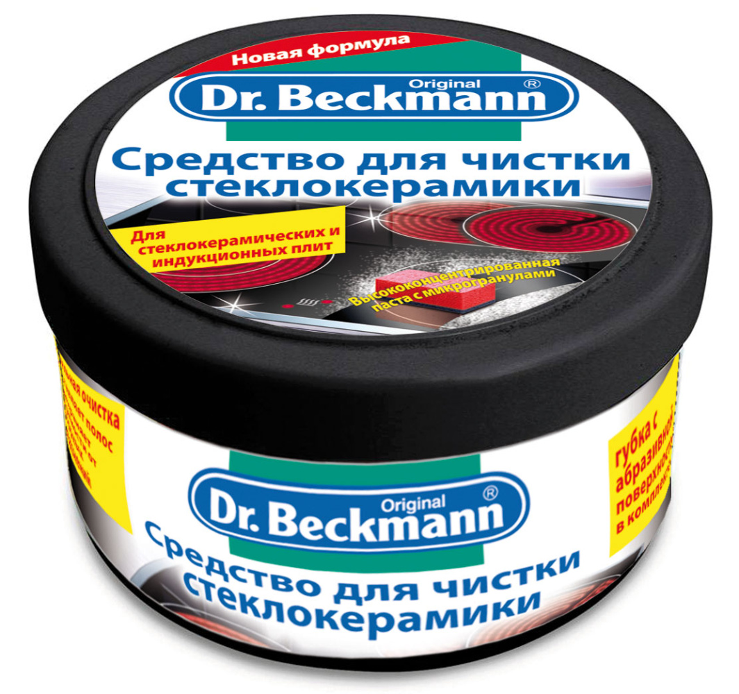 Производители рекомендуют чистить стеклокерамическую плиту только мыльными растворами или специальными средствами для стеклокерамики. Последние хороши тем, что не только очищают поверхность плиты, но и оставляют на ней грязеотталкивающую пленку, придают блеск.К таким специальным средствам относится "Паста для чистки стеклокерамики 250гр Dr.Beckmann". Средство для чистки стеклокерамики обеспечивает удаление даже самых стойких загрязнений, затвердеваний и пригара.