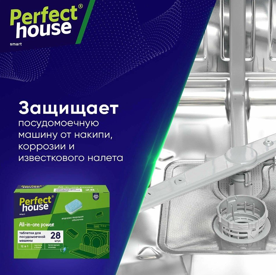 Многофункциональные таблетки для посудомоечных машин All in one Power 12 в 1 от бренда Perfect House Идеальная чистота и сияющий блеск вашей посуды!Таблетки для посудомоечных машин All in one Power справятся с чисткой и удалением даже самых сложных загрязнений - остатков пищи, жира и нагара. Водорастворимая пленка не требует разворачивания и полностью растворяется в воде.