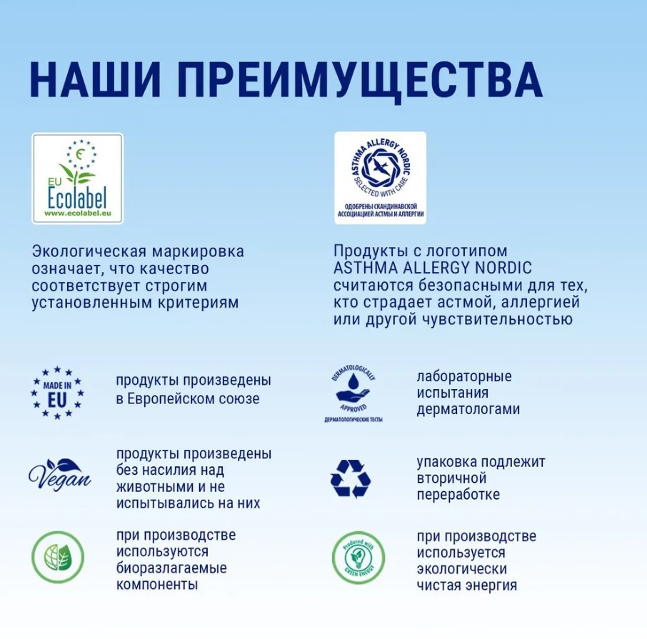 Гель для посудомоечной машины не содержит отдушек и красителей, что делает его еще более приятным в использовании.
