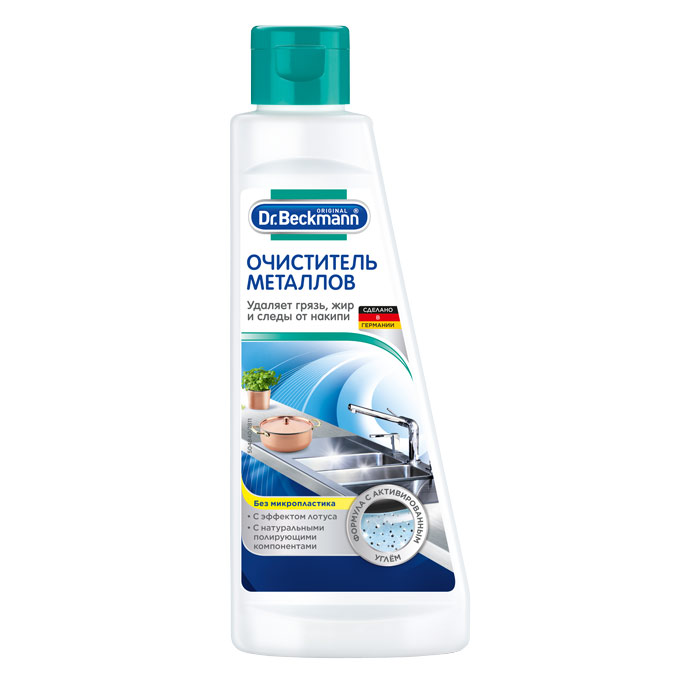 Металлические поверхности на кухне смотрятся стильно и современно. Но очень часто металл тускнеет и обычные чистящие средства не помогают. В этом случа6е вы сможете попробовать Очиститель металлов 250мл Dr.Beckmann.Очиститель металлов эффективно очищает и защищает поверхности. Специальная формула быстро и бережно чистит потускневшие, потерявшие цвет металлы. Также удаляет жирные пятна, пятна от воды. Деликатная чистка с натуральными абразивами и специальным воском придает изделиям не только бриллиантовый блеск но и не оставляет разводов. Защищает поверхность от потускнения и обеспечивает водоотталкивающий эффект. Подходит для изделий из хрома, меди, олова и серебра.