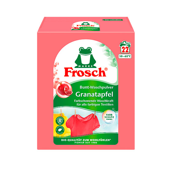 Отличная новинка которая достойно пополнила гранатовую серию бытовой химии Frosch.Порошок для стирки цветного белья концентрированный Гранат это высокая моющая способность, особенно для цветных тканей при температуре 20 °-60 ° C, но не подходит для натуральных шерсти и шелка.
