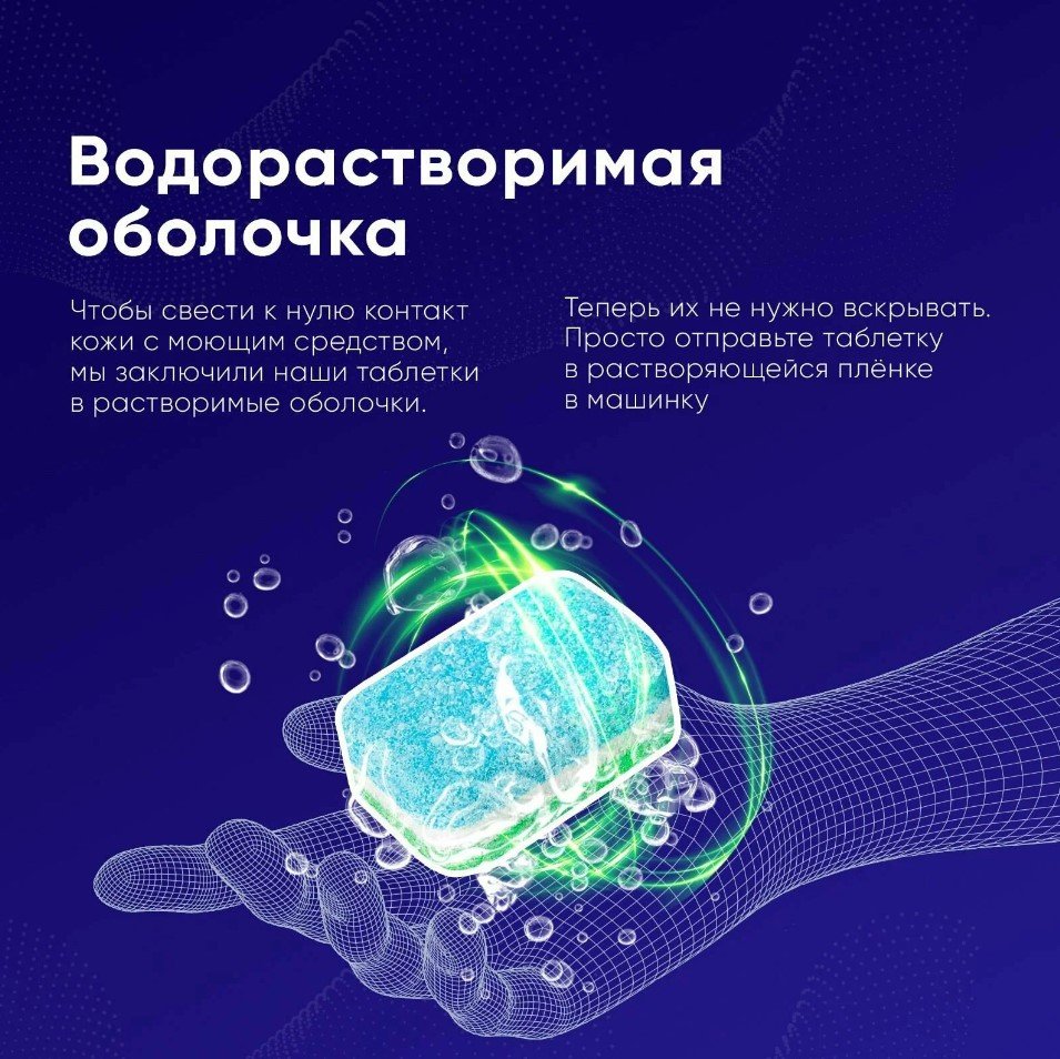 Поместите таблетку в отсек мойки машинки, не трогая мокрыми руками. Для наилучшего результата выбирайте температурный режим 50-55 °С или авто. Хранить при комнатной температуре, в сухом, недоступном для детей месте.